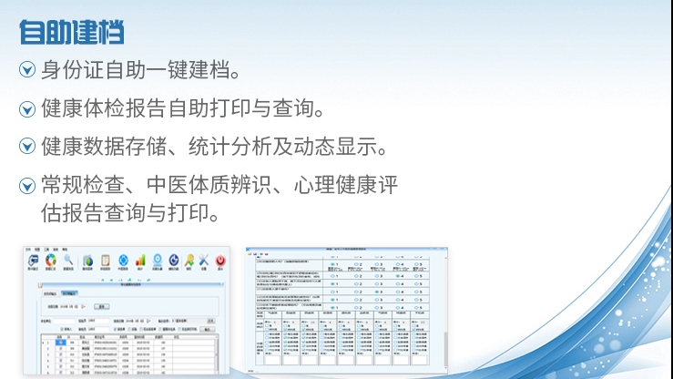 支持智能監(jiān)測(cè)設(shè)備接入,進(jìn)行數(shù)據(jù)的長(zhǎng)期追蹤、分析與評(píng)估。數(shù)據(jù)按及地方標(biāo)準(zhǔn)建立,內(nèi)置中醫(yī)體質(zhì)辨識(shí),醫(yī)生可現(xiàn)場(chǎng)分析中醫(yī)體質(zhì)。